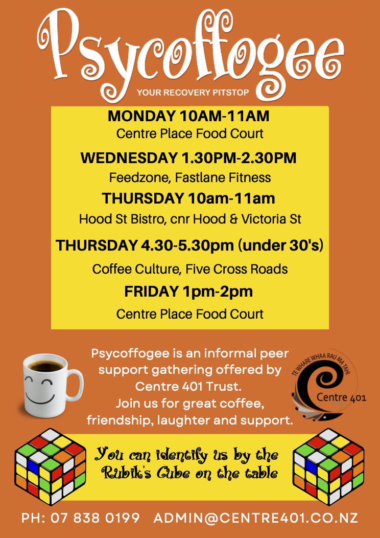 Psycoffogee goes for an hour and is held at a local bar or cafe. A Rubik’s cube will be visible on the psycoffogee table to easily identify it to newcomers. Loneliness is worse than smoking a pack of cigarettes a day so come and join us! You don’t have to be a member of Centre 401 Trust to attend Psycoffogee, you just need to be a peer.