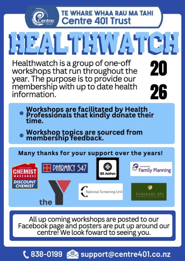 These cover a range of physical health topics over the year. Experts from the community facilitate these workshops and can answer questions you have on their particular health area. Workshops are advertised on the Centre 401 notice boards and in Planet 401 Magazine. It is important to register for these workshops. Centre 401 hosts 6 Health Watch workshops a year.